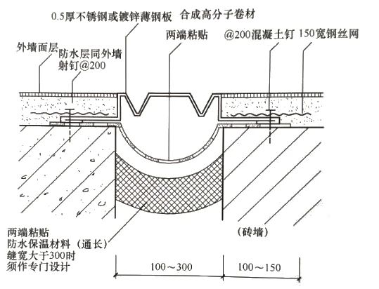 3、蓋板前在接縫上粘貼200mm寬高分子咬合型接縫帶;蓋板在變形縫兩側與外墻飾面層之間采用單組分聚氨酯建筑密封膠密封;