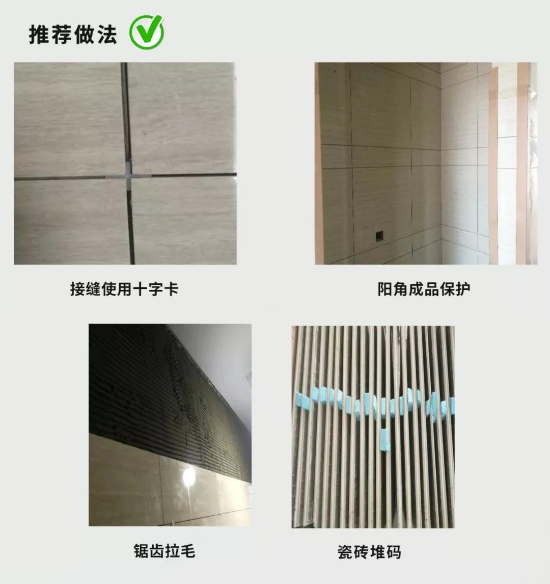 現(xiàn)場施工,清理瓷磚背后的脫模劑,之后把攪拌好的膠漿均勻涂布于瓷磚背面,用齒型刮板將膠漿涂于工作面之上,然后握住齒形刮板使其齒邊與基面形成60°角,把膠漿層梳理成均勻條狀;在膠漿的晾置時(shí)間(大約15分鐘)內(nèi),把瓷磚鋪壓到位;在垂直于梳理方向輕微搓動(dòng)排除磚里空氣。